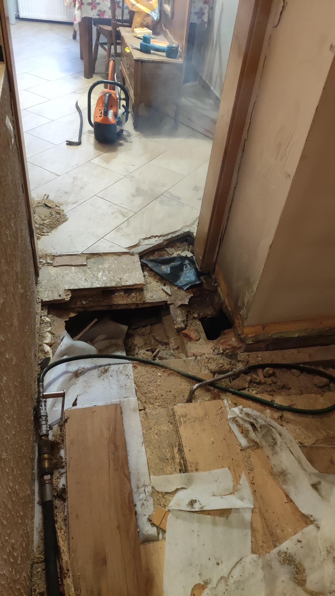 By ugasić pożar konieczna była poważna rozbiórka domu, zdemontowanie części podłogi oraz sufitu w mieszkaniach sąsiadujących z kominem.