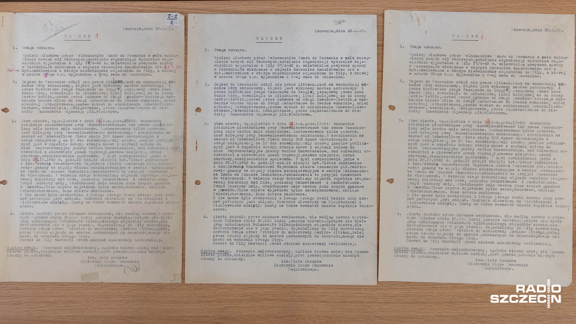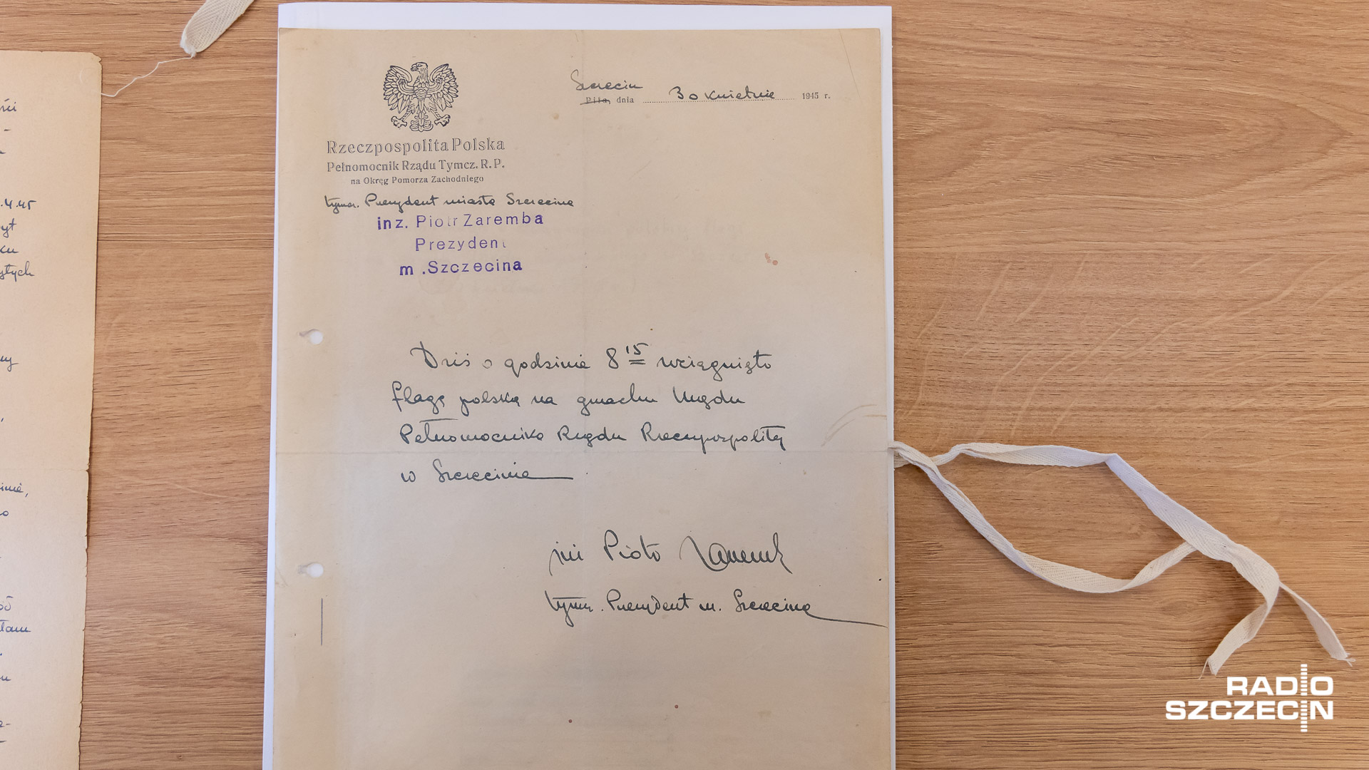 Umieściła ją tam polska ekipa administracyjna, która przyjechała z Piły. - Flaga pojawiła się na budynku dawnej niemieckiej Rejencji szczecińskiej - mówi Bartosz Sitarz z Archiwum Państwowego w Szczecinie. - Zachowała się odręczna notatka podpisana przez Piotra Zarembę, czyli pierwszego prezydenta Szczecina informująca o wciągnięciu polskiej flagi na maszt. Zachował się również raport sporządzony przez Piotra Zarembę 30 kwietnia 1945 roku informujący o przebiegu całego wydarzenia. O tym, jak polska administracja zajęła gmach urzędu.