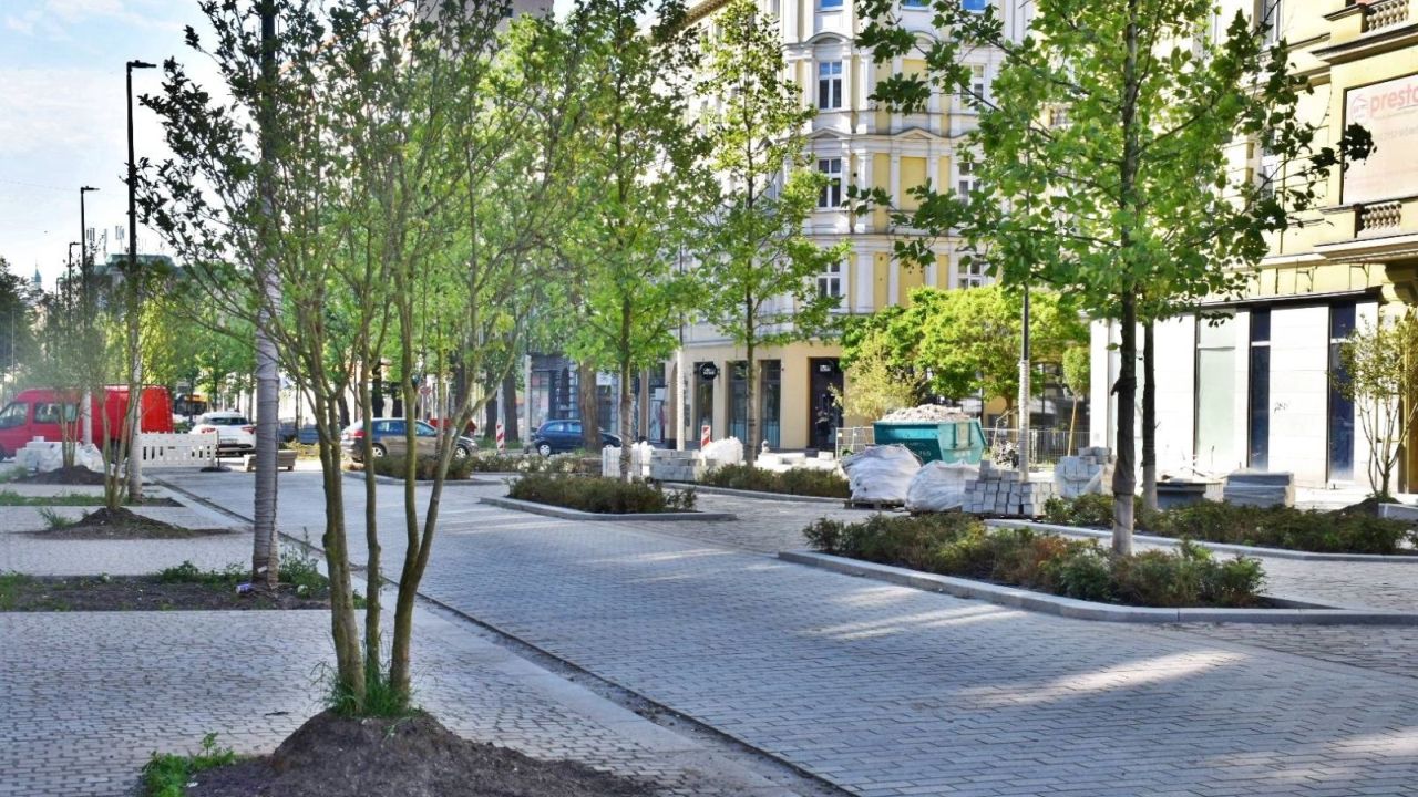 Główne prace trwają teraz w okolicy pl. Zgody. Powstaje tam nowa jezdnia z kostki i chodniki, nasadzane są krzewy i drzewa.