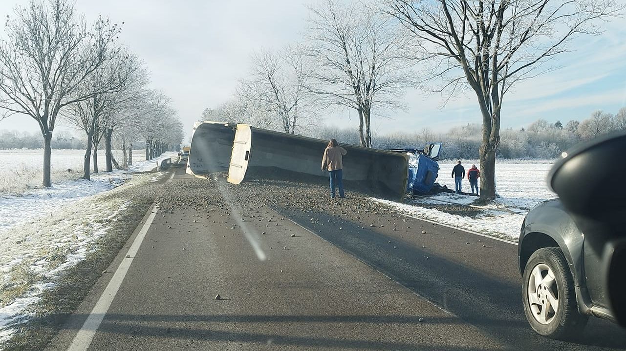 Ciężarówka przewróciła się na drodze krajowej nr 20.