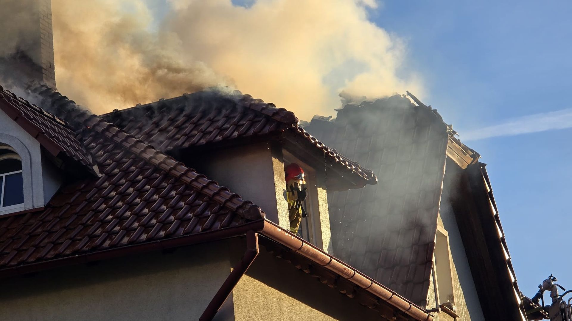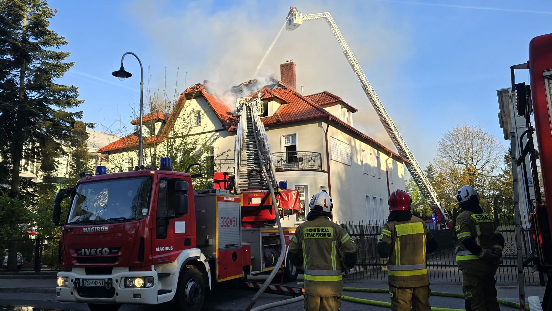 Pożar dachu przy ulicy Piłsudskiego w Koszalinie. Na parterze budynku mieści się przedszkole, na piętrze - lokale mieszkalne.