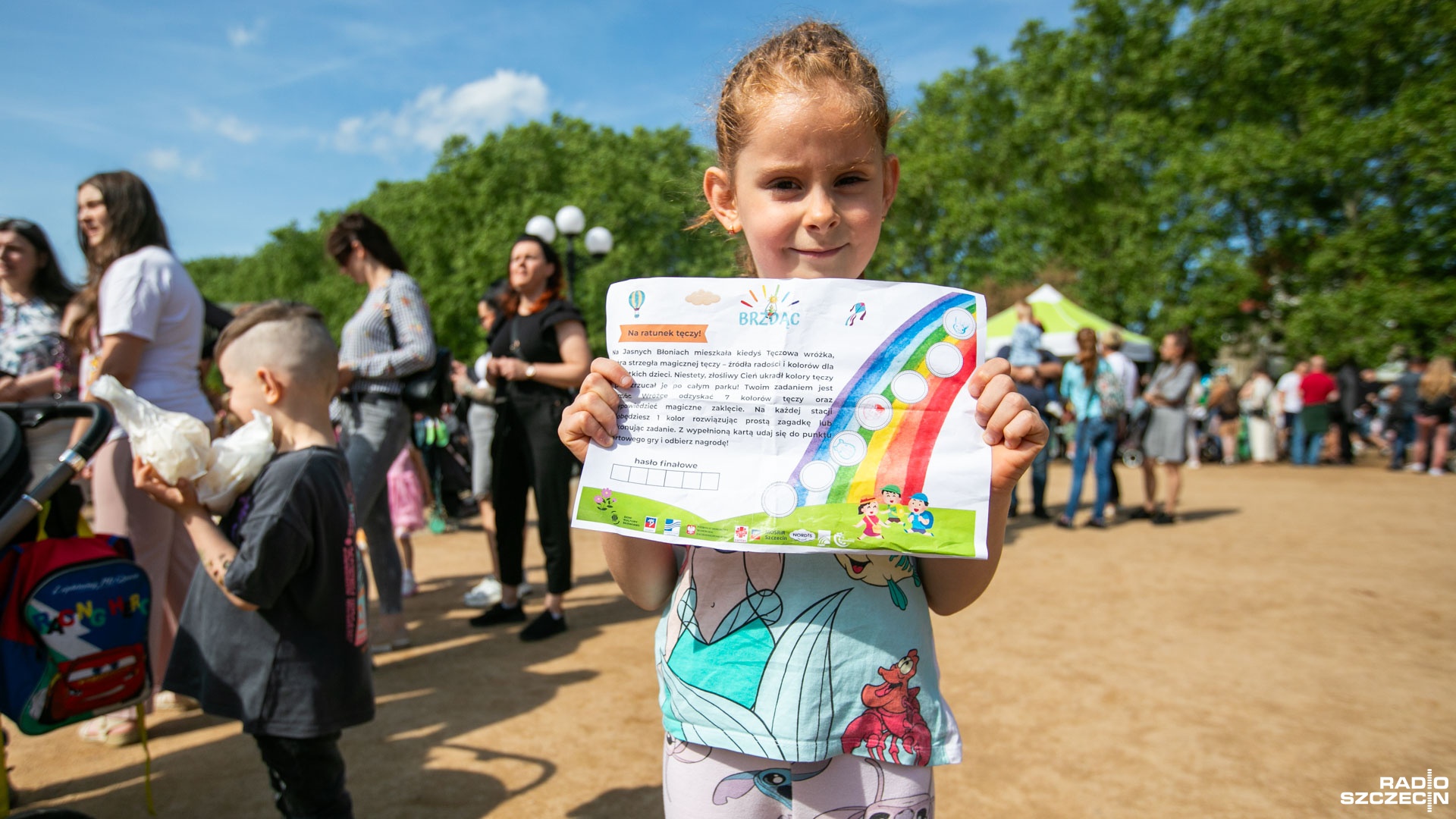 - Kolejka do malowania buzi. - Chcę być rysiem. - Kotkiem. - Ta kolejka do zamków dmuchanych. Stoimy z 10 minut. - To jest Blue i Bingo. To taka bajka. - Ja zbieram takie pieczątki, żeby dostać nagrodę. Tak ogólnie to mi mama mówi co mam robić, bo ja jeszcze uczę się czytać. Mam trzy pieczątki, a zostało mi... raz, dwa, trzy, cztery - mówią dzieci i rodzice.