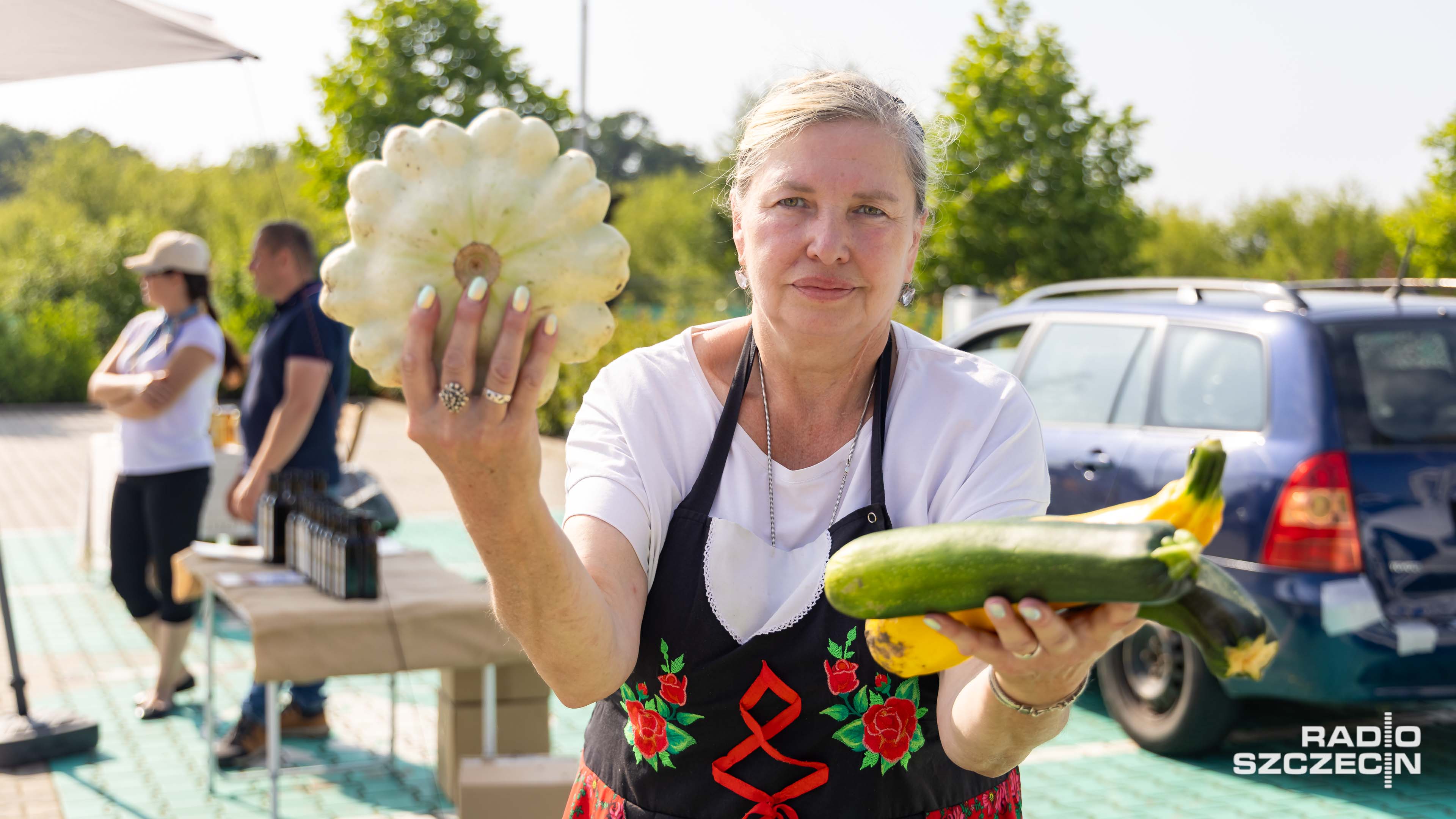 - Holenderskie odmiany cukinii, wyselekcjonowane... Staramy się uprawiać to bardzo ekologicznie. - To są sery kozie, kozy się pasą na [obszarach - przyp. red.] Natura 2000 nad jeziorem Dąbie. Najzdrowsze mleko kozie, nie ma zdrowszego. - Wszystko jak u mamy: fasolka, przetwory, ciasta, owoce z własnego sadu. I słoiczki; czym chata bogata! - Mam miód wielokwiatowy, bardzo zdrowy na wątrobę, bo ma ostropest, nawłoć i gorczycę. Ten znów na serduszko, bardzo zdrowy, bo ma mniszek lekarski, klon i buk. No: produkty lokalne - zachęcali.