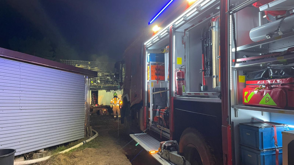 Pożar domu w Żelewie. Ogień pojawił się wewnątrz budynku i następnie przeniósł się na dach.