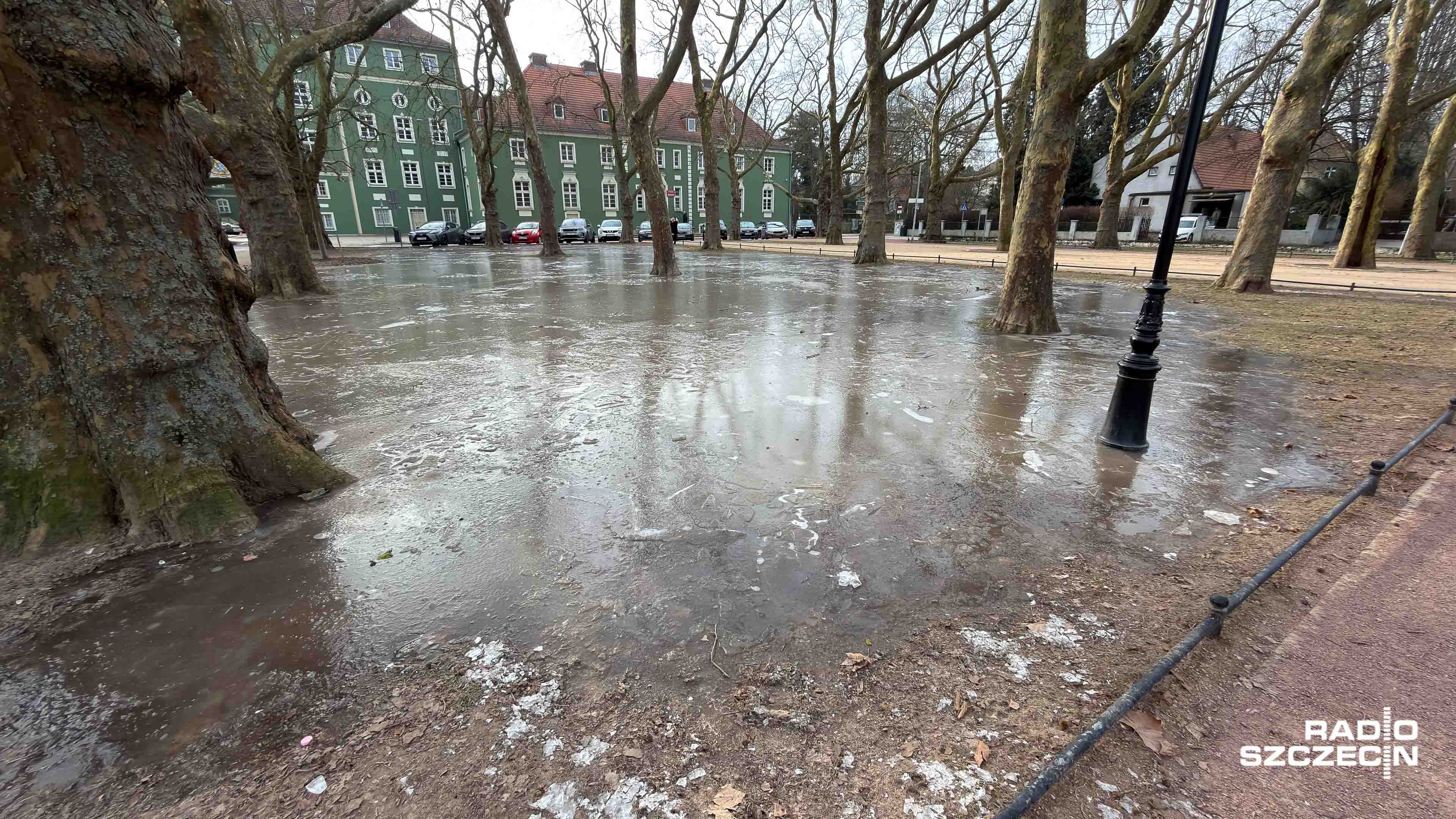 Szczecińskie Jasne Błonia pokryła tafla lodu. To za sprawą nocnego mrozu, który skuł zalegająca po odwilży wodę i utworzył naturalną ślizgawkę.