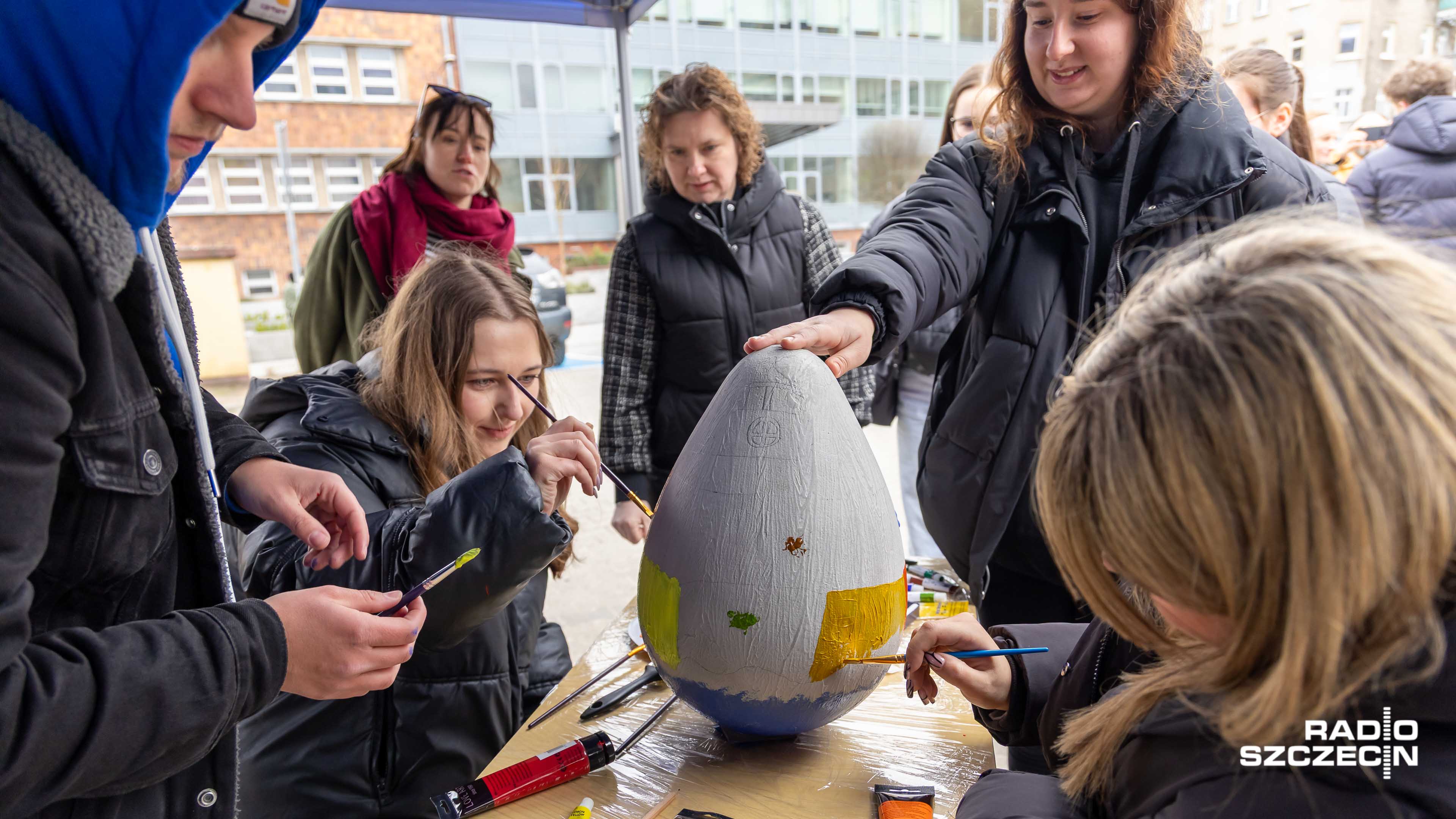 - Jest to pingwin, w kapeluszu, jeszcze została spódniczka, jeszcze został dziób, okulary, płetwy, taki w letnej stylizacji. - Postawiliśmy przede wszystkim na akcent niebieskiego, czyli koloru naszego wydziału, ale też mamy wzorki, ciąg zer i jedynek. Żeby to jajo wbrew pozorom było informatycznym jajem. - Mamy jagnię, jest kot, tam jest koń, są zajączki i piesek gdzieś tam, już nie wiem, z którejś strony go nie widzę. Taka fajna inicjatywa, szkoda tylko, że jest zimno - mówią uczestnicy.