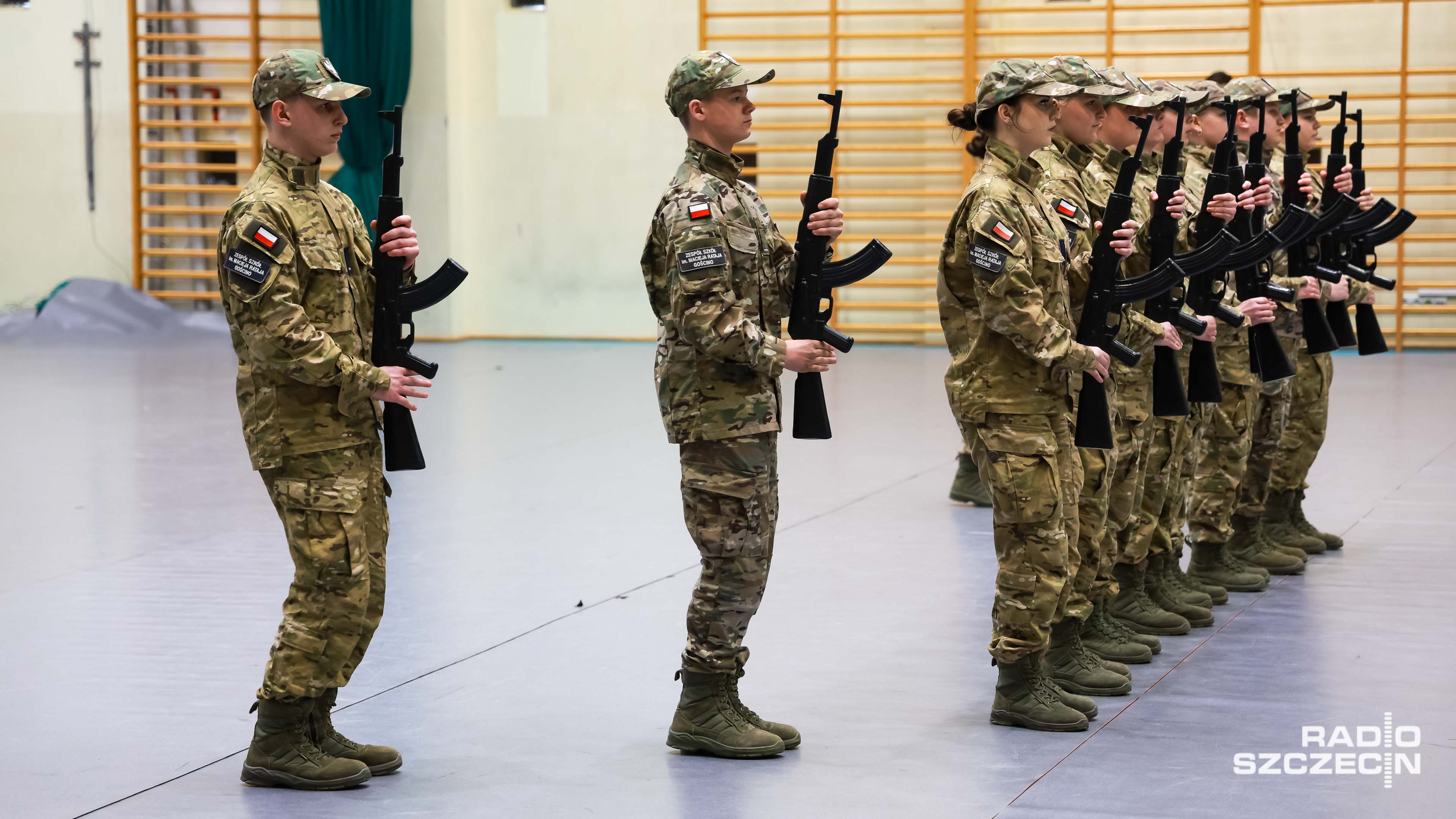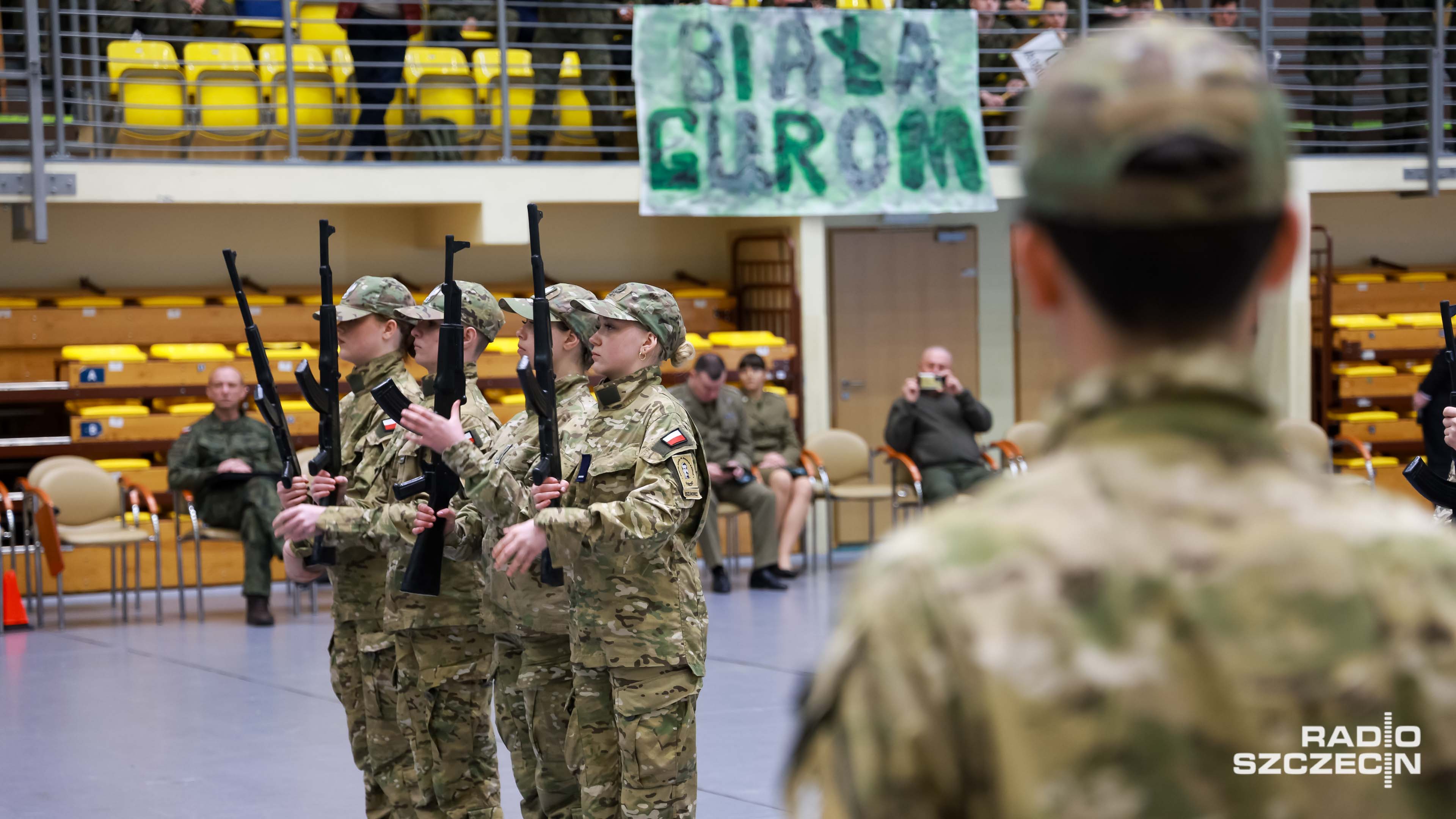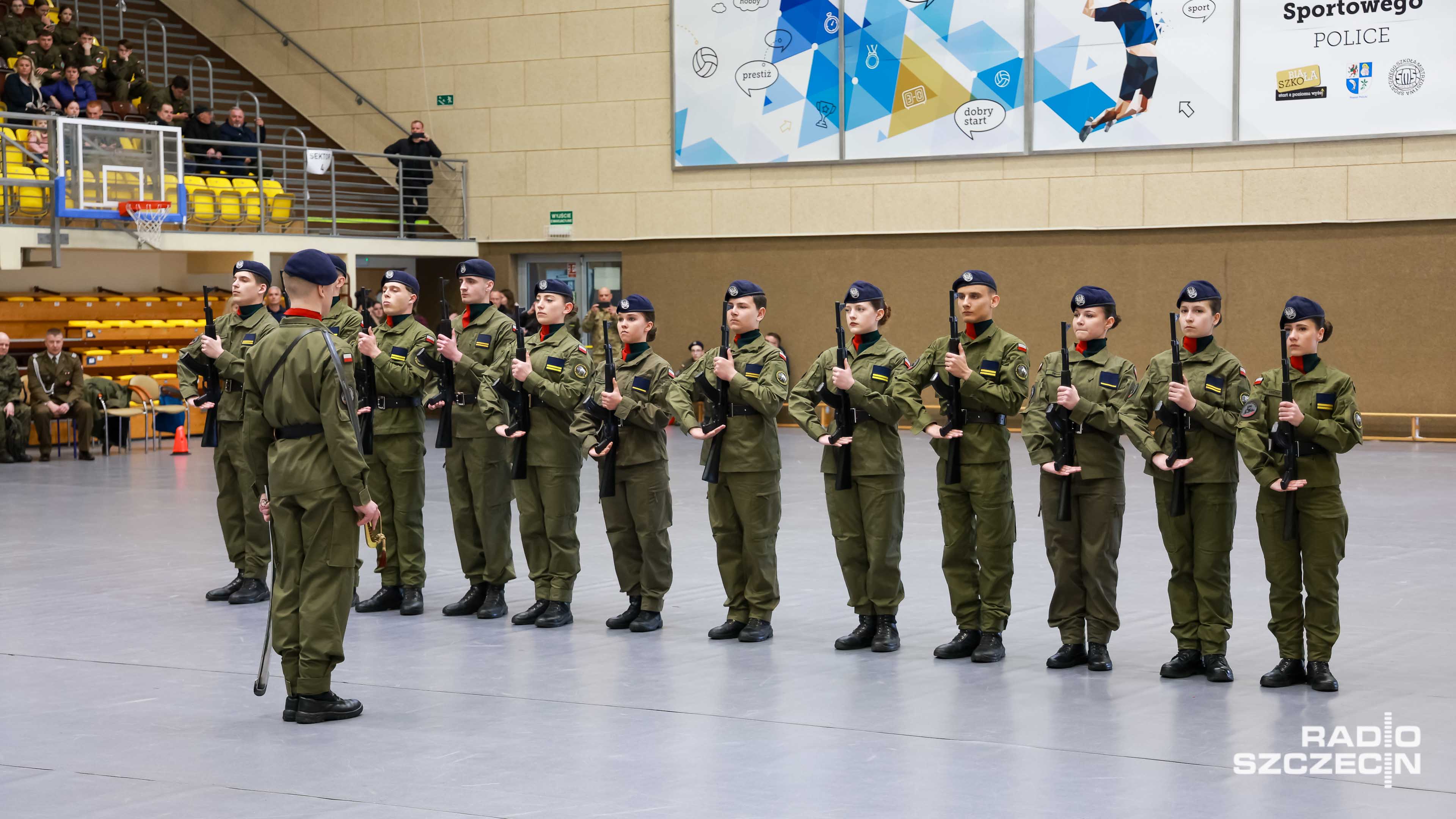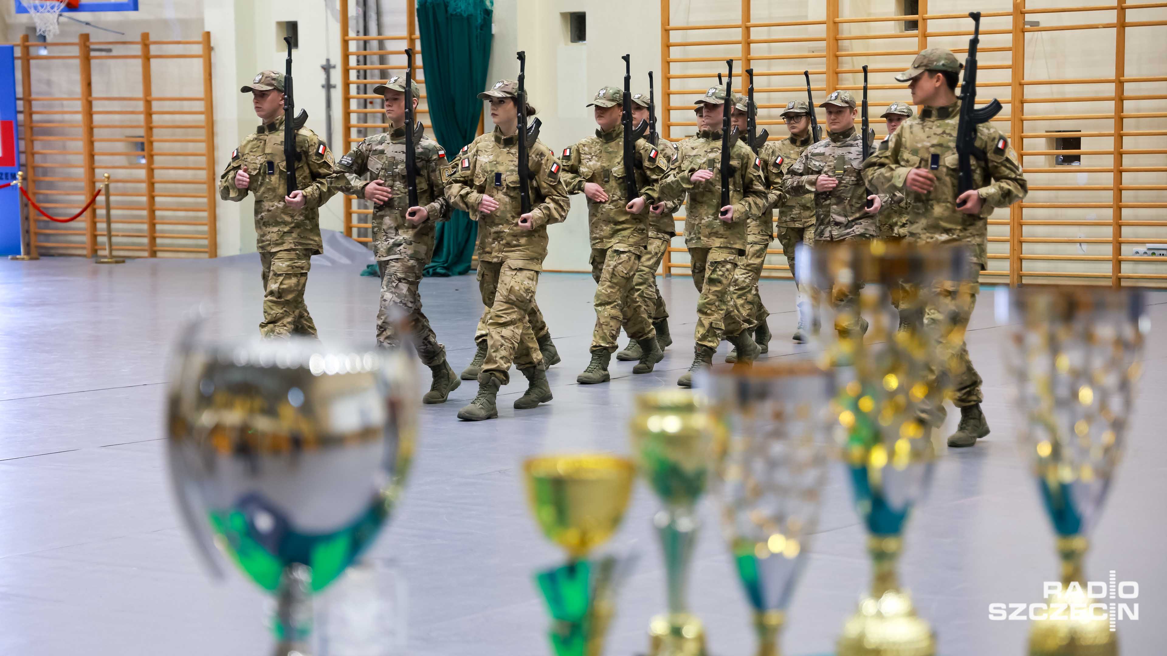 Były salwy, precyzyjne zwroty i przerzuty bronią - dodajmy - gumową. Szkolna hala widowiskowo-sportowa w Policach zmieniła się w arenę wojskowej precyzji i dyscypliny.