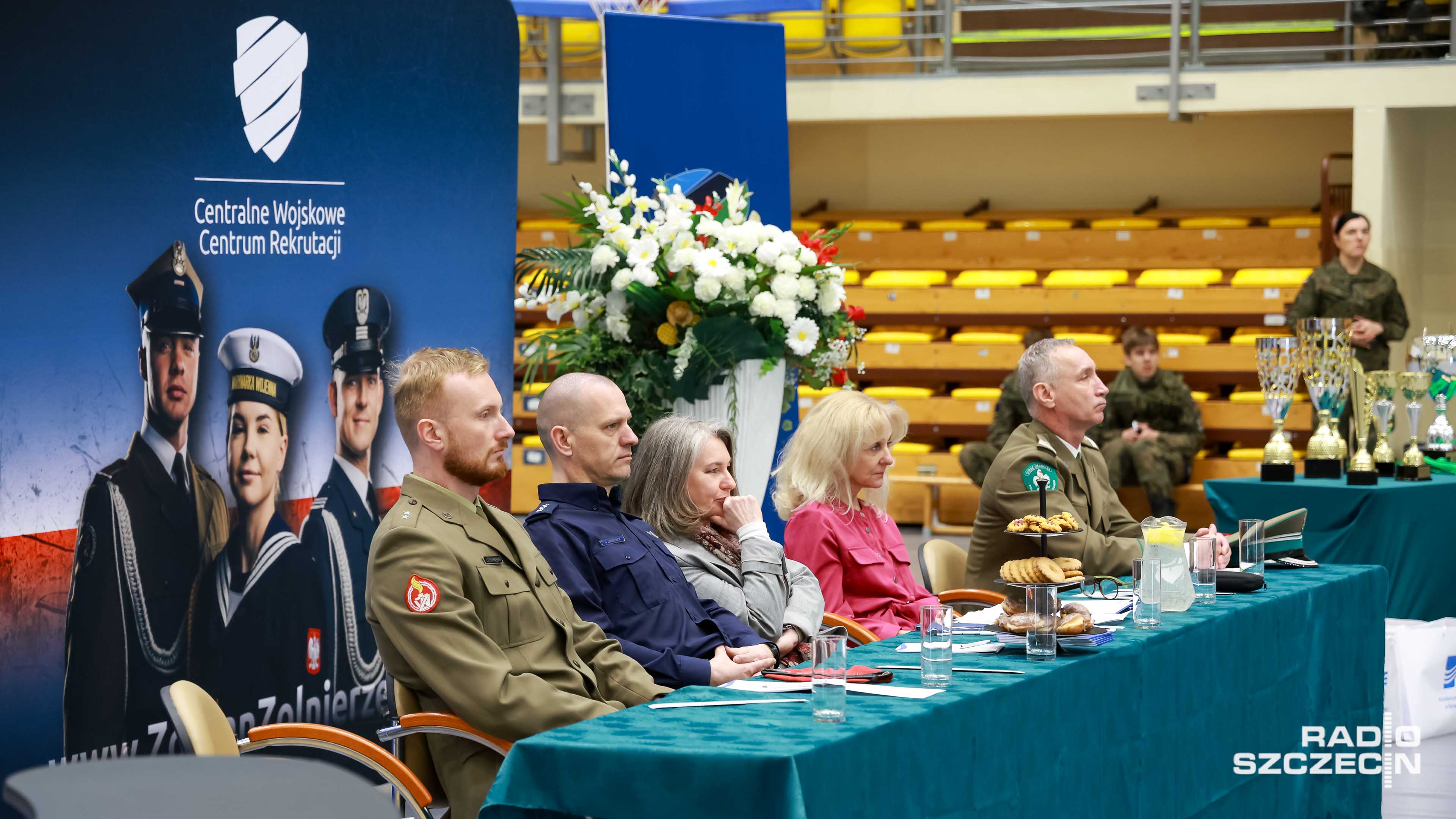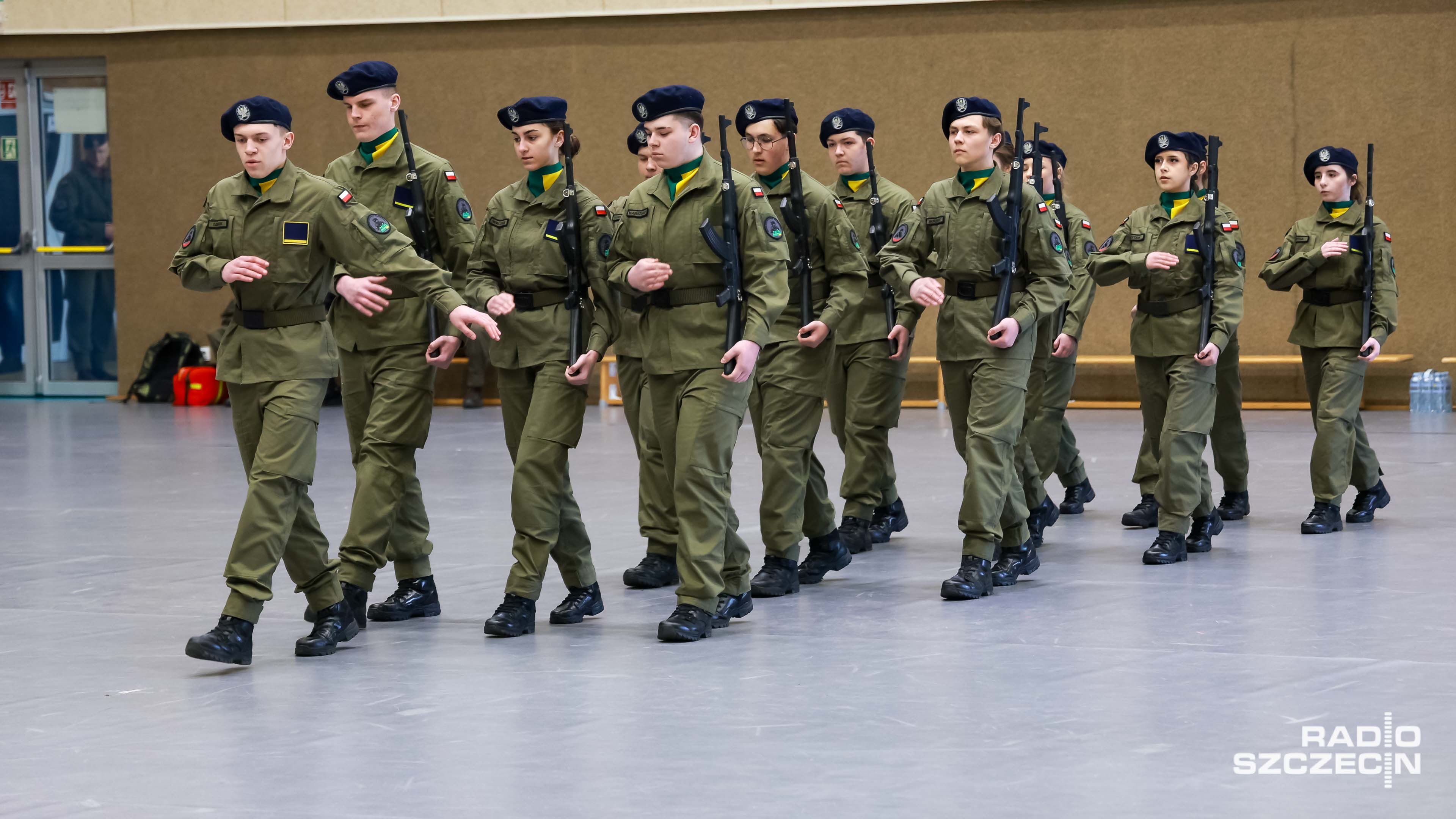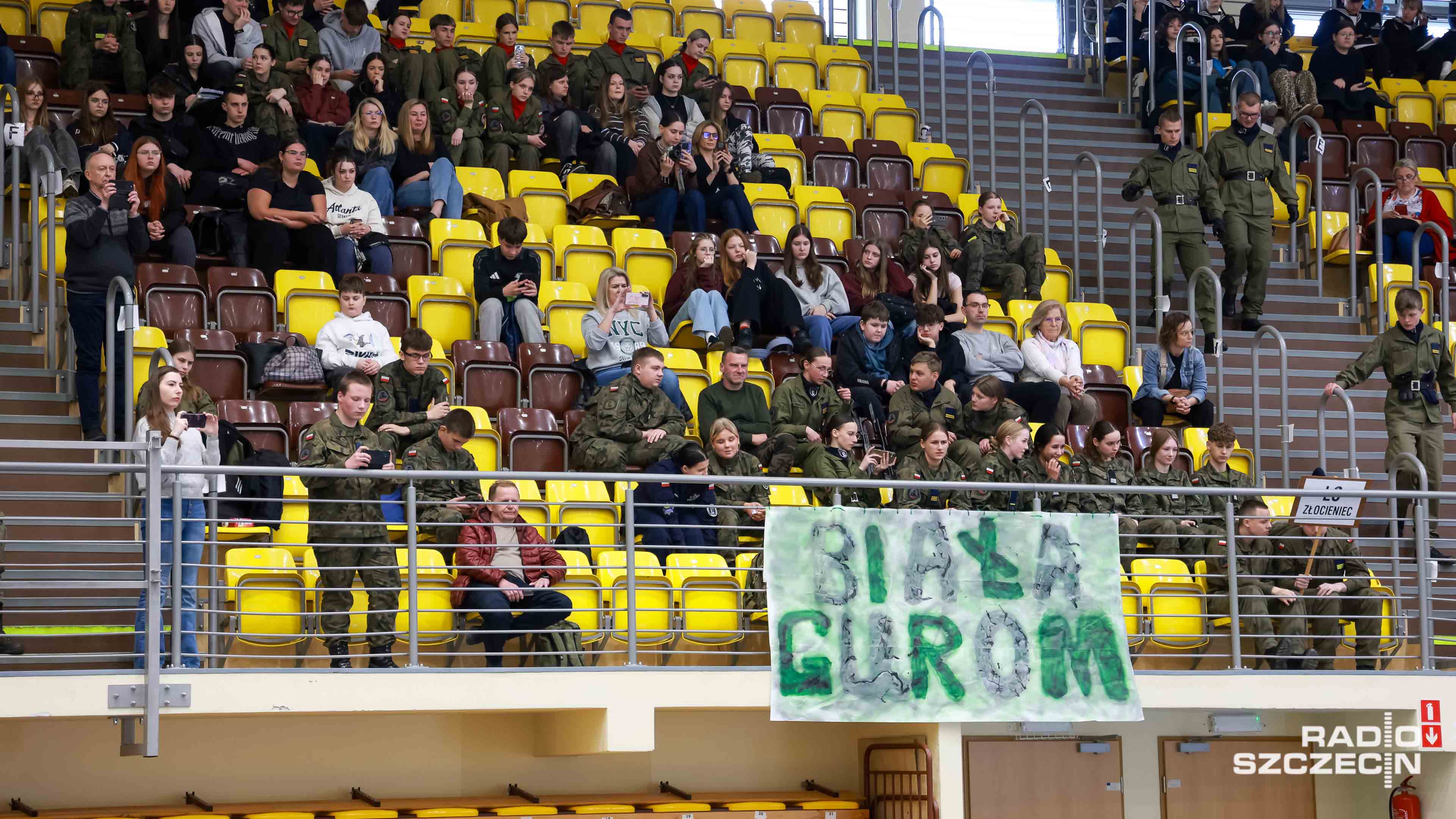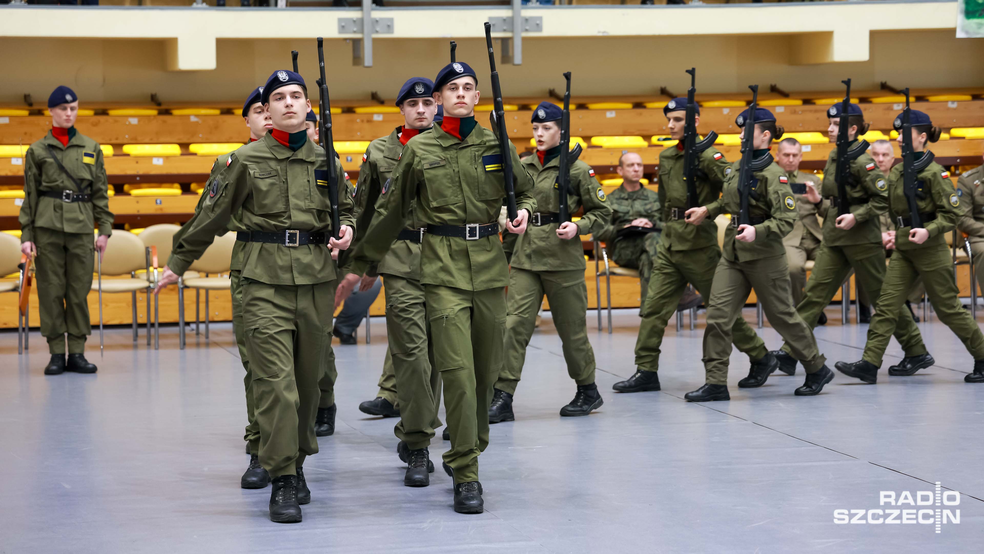 Były salwy, precyzyjne zwroty i przerzuty bronią - dodajmy - gumową. Szkolna hala widowiskowo-sportowa w Policach zmieniła się w arenę wojskowej precyzji i dyscypliny.
