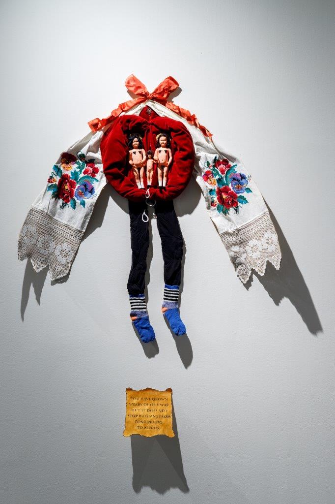 Asamblaż tekstylny powstały w 2022 roku w kontekście doświadczenia wojny i przymusowej migracji stanowi intymny, a zarazem polityczny zapis kondycji uchodźczej. Wykorzystanie osobistej odzieży i znalezionych materiałów nadaje pracy charakter materialnego archiwum codzienności w stanie nieustannego zawieszenia. Dzieło rozwija wątki obecne w twórczości artysty związane z queerową narracją, pamięcią i tożsamością, poszerzając kolekcję o perspektywę doświadczenia migracyjnego i postwojennego.
