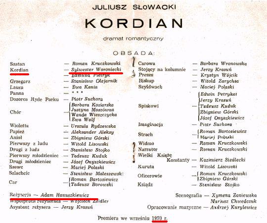 W wieku 87 lat zmarł wybitny aktor i reżyser teatralny Adam Hanuszkiewicz. Współtwórca i pierwszy naczelny reżyser Teatru Telewizji. Od 1956 roku reżyser i dyrektor Teatru Powszechnego. W 1968 roku objął fotel dyrektora Teatru Narodowego, po usunięciu Kazimierza Dejmka za głośną realizację "Dziadów". Stworzył wiele wybitnych inscenizacji dzieł m.in. Juliusza Słowackiego: "Balladynę" w nowoczesnych kostiumach oraz z wykorzystaniem motocykli, czy "Kordiana", który zamiast na Mont Blanc, wchodził na drabinę. W Warszawie w roli tytułowej występował Andrzej Nardelli. Hanuszkiewicz przeniósł tę sztukę również na deski Teatru im. Juliusza Osterwy w Lublinie. Kordiana grał Sylwester Woroniecki. Premiera miała miejsce 6 września 1970 roku - osiem miesięcy po premierze w stolicy. O współpracy z Adamem Hanuszkiewiczem i fenomenie jego teatru Konrad Wojtyła rozmawia z Sylwestrem Woronieckim.
