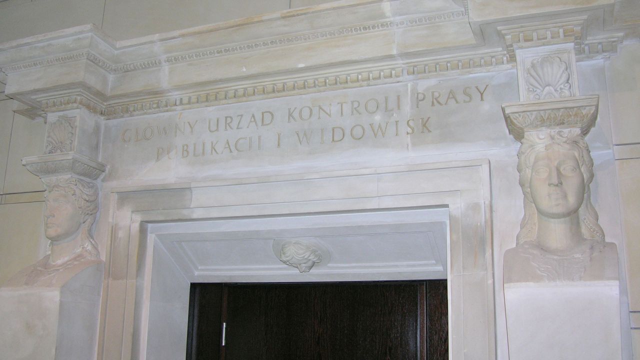 Portal ze zburzonej siedziby Głównego Urzędu Kontroli Prasy, Publikacji i Widowisk wyeksponowany w holu biurowca Liberty Corner przy ul. Mysiej 5 w Warszawie. źródło: https://pl.wikipedia.org/wiki/Cenzura_w_Polskiej_Rzeczypospolitej_Ludowej