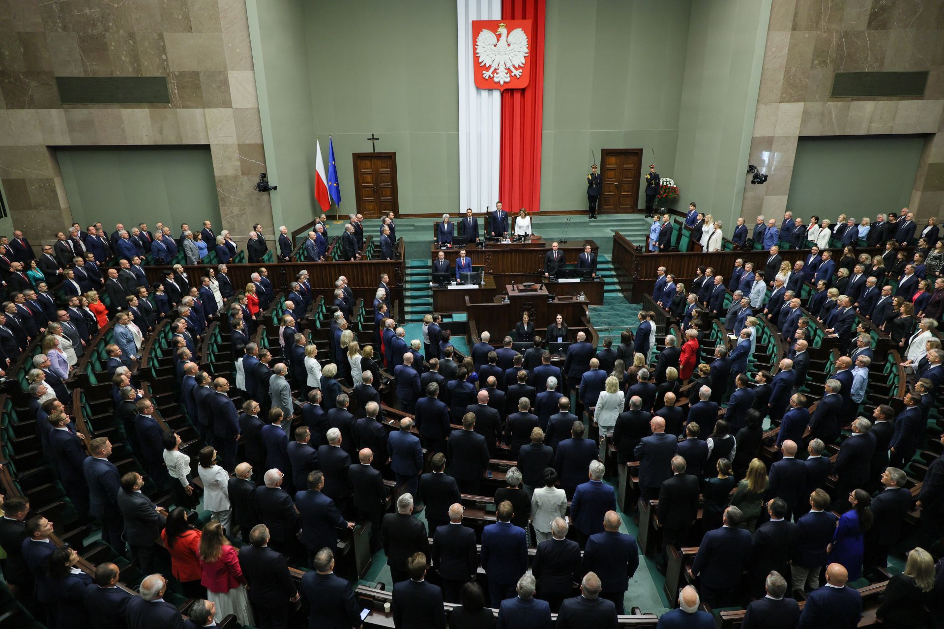 - Dziękuję bardzo. Stwierdzam, że prezydent Rzeczypospolitej Polskiej, pan Karol Tadeusz Nawrocki złożył wobec Zgromadzenia Narodowego przysięgę przewidzianą w artykule 130. Konstytucji Rzeczypospolitej Polskiej - ogłosił marszałek Sejmu Szymon Hołownia.