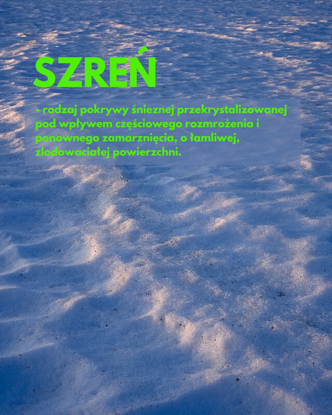 Do grona zimowych słów można też zaliczyć szreń, czyli rodzaj pokrywy śnieżnej, powstającej pod wpływem częściowego rozmrożenia i ponownego zamarznięcia śniegu. Lepiej znana wszystkim szadź to osad lodu powstający przy zamarzaniu małych, przechłodzonych kropelek wody.